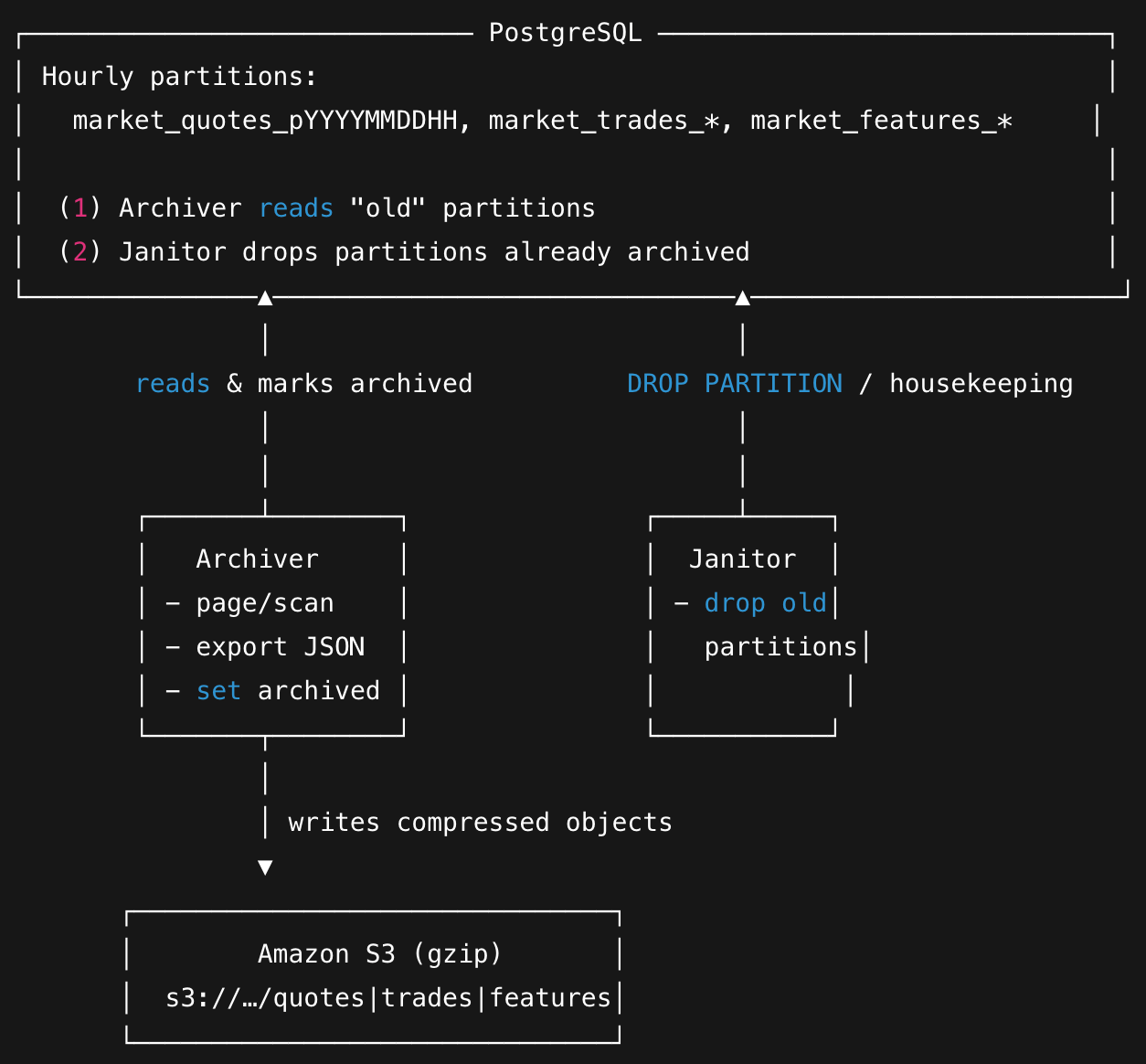 The solution is to partition the tables: instead of just having one market_features, market_quotes, or market_trades table, a new one with a timestamp is created every hour. Partitioning transforms cleanup from a row-level operation to a metadata operation — instead of deleting millions of rows, a partition can be dropped in O(1) time, quickly freeing space and avoiding table-wide locks. After each table is filled up, the system moves on to filling the next table, and after a table is archived, the janitor can simply DROP TABLE, destroying it entirely and freeing up space for the rest of the system. (The janitor is set to a default of keeping quotes for 2.4 hours, even if they have been archived; trades for 3.6 hours; and features for 6 hours. These are very conservative numbers, originally meant to be appropriate for a system which had only 20GB of disk space; when strategies are built in greater detail, I will consider raising them).