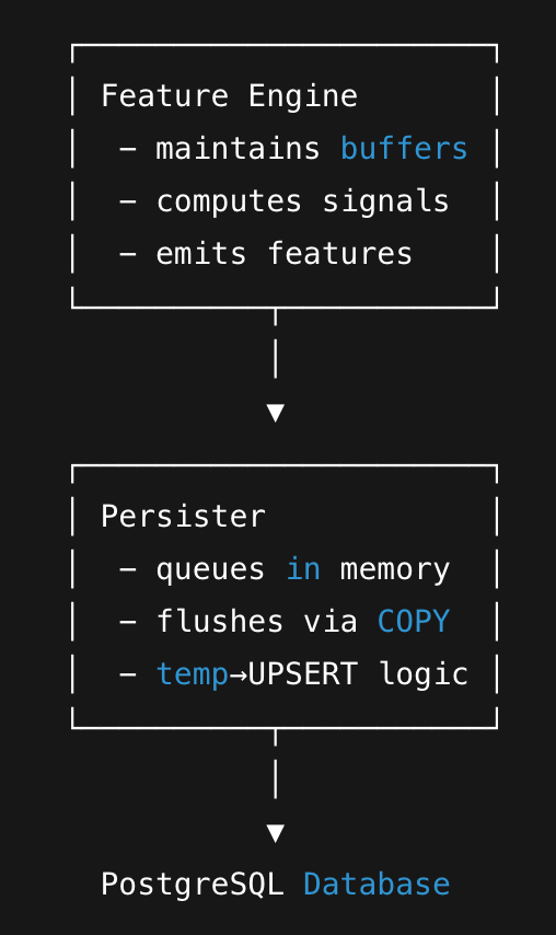 Solving these problems required building a batching and staging pipeline, made up of a feature engine and a persister. The feature engine is the first to look at content taken in from the websocket. It keeps enough recent history in memory to compute rolling signals, and emits a new feature when something interesting happens in the market, like a change in price/volatility/liquidity (...and eventually we will need to also analyze book depth here). The feature engine also enforces hard caps on per-token buffers to keep memory from ballooning during news spikes (because we are computing rolling signals, dropping repetitive signals should not cause the database to actually lose any information). Then, the feature engine passes all of its information to the persister, which needs to actually…persist our information.